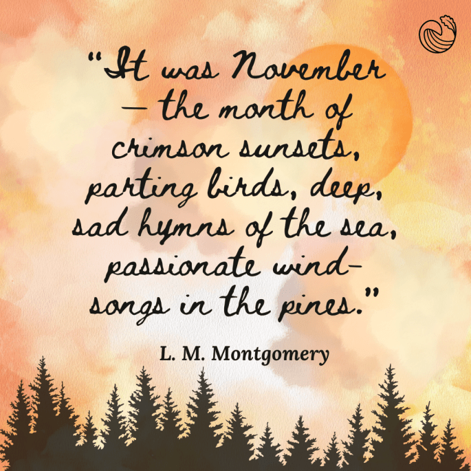 - “It was November — the month of crimson sunsets, parting birds, deep, sad hymns of the sea, passionate wind-songs in the pines.” – L. M. Montgomery